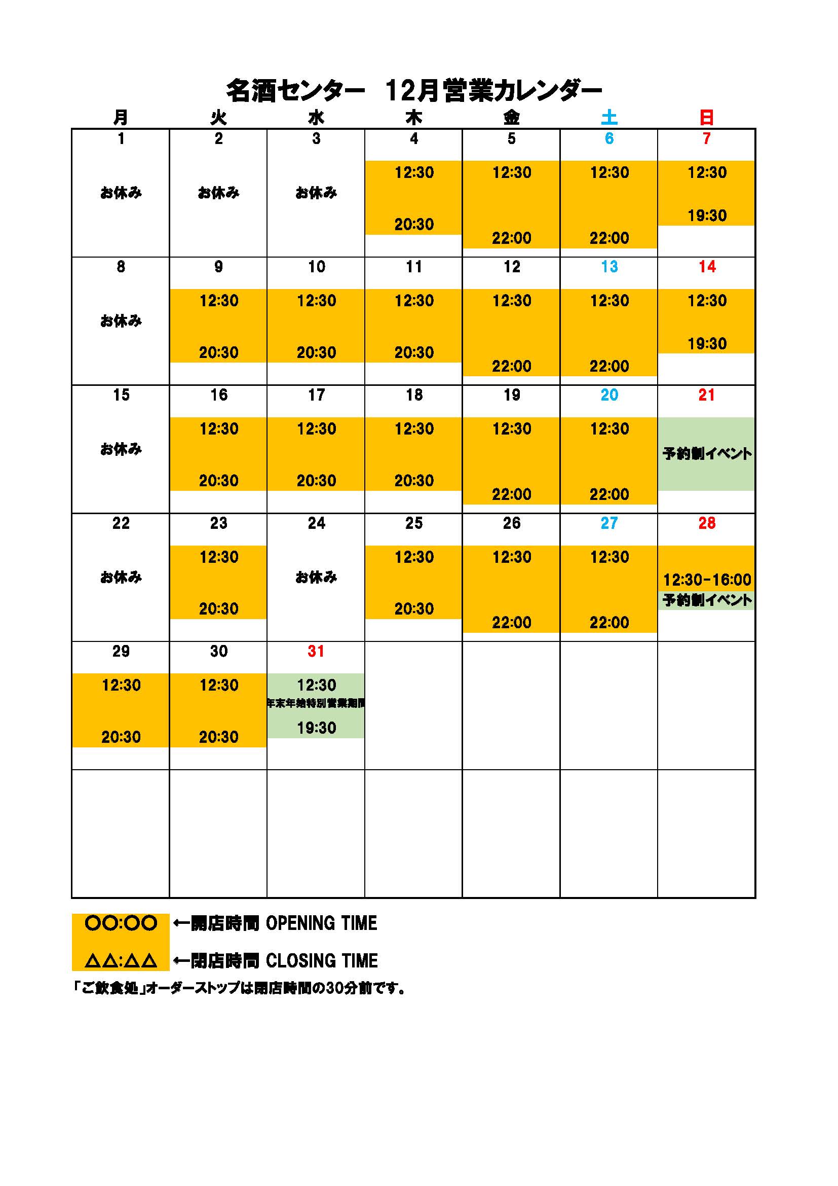 12月のお休みは、1日(月)、2日(火)、3日(水)、8日(月)、15日(月)、21日(日)、22日(月)、24日(水)です。