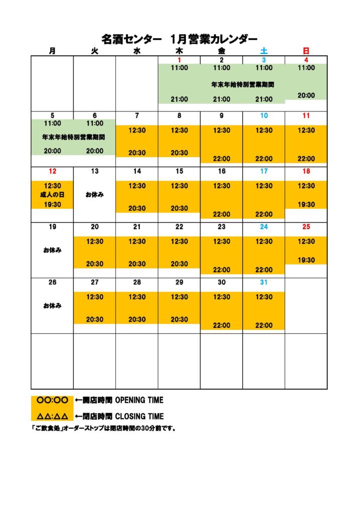 1月のお休みは、13日(火)・19日(月)・26日(月)です。