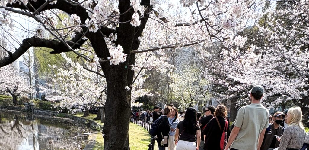 河津桜、熱海桜と親しまれてきた寒緋桜系の濃い緋色の桜が咲き始まめるのは一月も末の頃。そこから初まり、小さな花をぴっしりと付ける豆桜が咲く。豆桜はかさかさした乾いた花弁を持っている。外濠の土手には山桜の老木も多い。以前は、桜が咲き始めたと言えば、外濠公園はお花見の場所取りをする人で賑わったが、コロナ流行以降はお花見の景色も様変わりで、会社ぐるみのお花見は少なくなった。