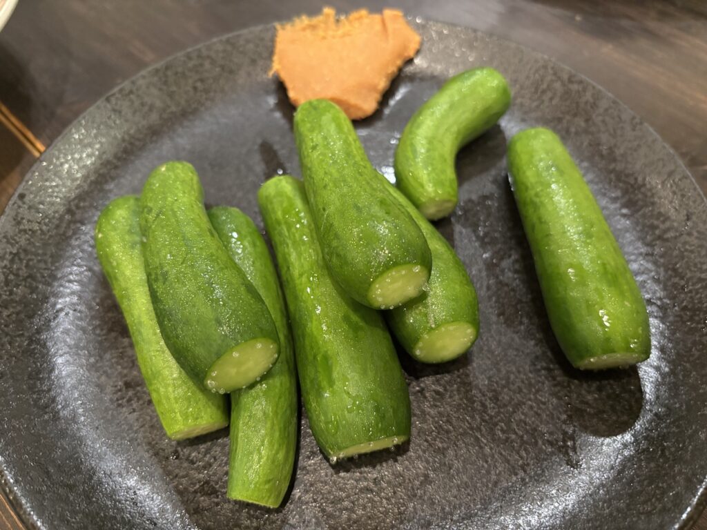 最初に出してくれた現地のきゅうり、品種名「きゅう太郎」の生。普通のきゅうりの半分くらいの長さで、ぷっくりと下膨れ。かわいい。味噌をつけて皮ごとがぶっと食べるとみずみずしくて最高。