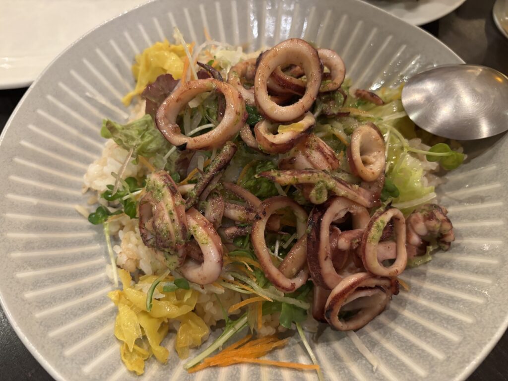 途中から日本酒、地元加藤酒造の「金鶴」本醸造零下貯蔵が登場。佐渡は米どころでもあり、日本酒もうまい。スイスイと飲んじゃって、次に出てきたのは同じ金鶴の純米酒「風柔(かぜやわらか)」これもおいしかった。締めは「イカのバターライス」。絶品。