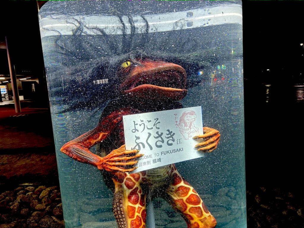 なんだろうと見てると、下から真っ黒い髪のカッパが現れた。福崎のシンボルキャラ・ガジロウだ。話には聞いていたが、かなり不気味コワくていい。最近の駅キャラは全国どこに行っても同じようなアニメカワイイ路線でおじさんは少々ウンザリしていたのだ。こういう強烈な個性を打ち出す駅がもっと欲しい。福崎エライ。