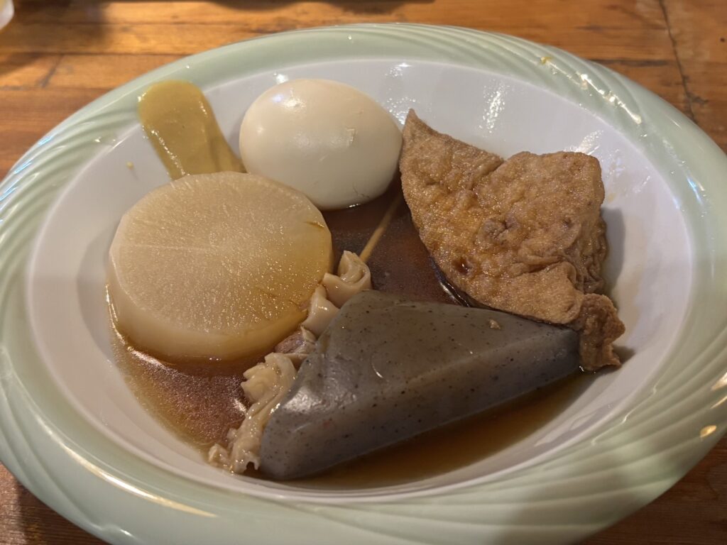 すごく感じのいい大将で、すすめられるままにおでんを頼んだ。そしたら常連の女性客が「姫路おでんてな、出汁が生姜醤油なんや」と教えてくれた。さっぱりしていておいしい。辛くはない。常連さんたちの関西弁が心地いい。