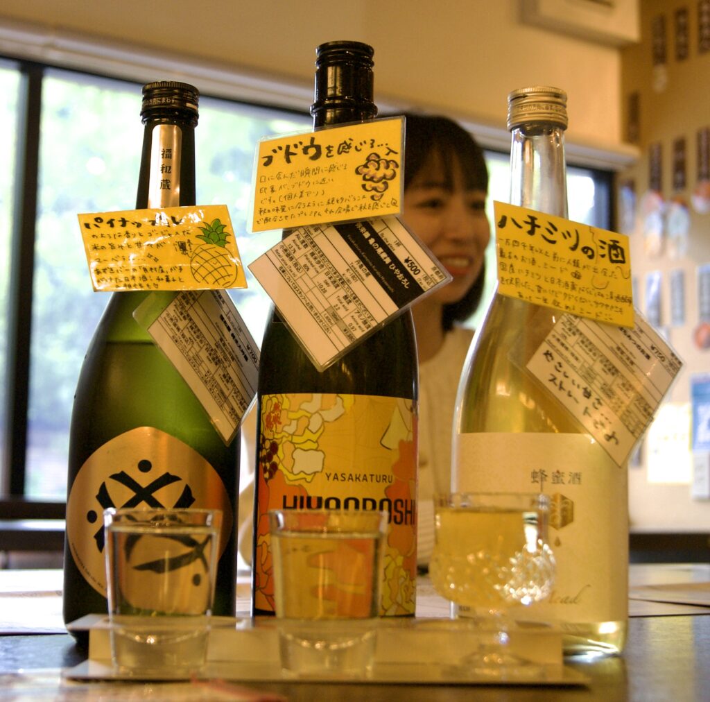 「『福和蔵 純米大吟醸』(福和蔵・三重県)はフルーティ―でパイナップルの味が確かにします。南国の香りがします。『亀の尾蔵舞』(竹野酒造・京都府)はフルーティ―だけどこっちよりはきりっとしていて時間をかけて、愉しみたいです。『蜂蜜酒』(天鷹酒造・栃木県)もすごく好きな味です。食事にも合いそうですね」。